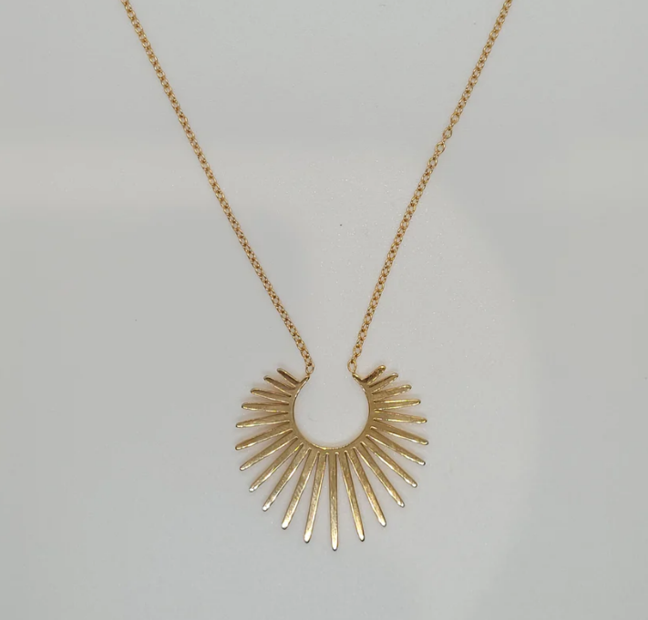 Collar con forma de sol luminosa y simbólica, con un colgante de sol que representa energía y vitalidad.