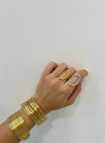 Pieza de joyería minimalista y moderna que se caracteriza por su diseño geométrico y limpio.