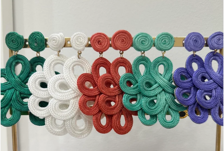 Pendientes artesanales de colores vibrantes (blanco, rojo, verde y morado) con diseño de espirales y lazos entrelazados, hechos de hilo trenzado. Tienen un aspecto floral y llamativo.