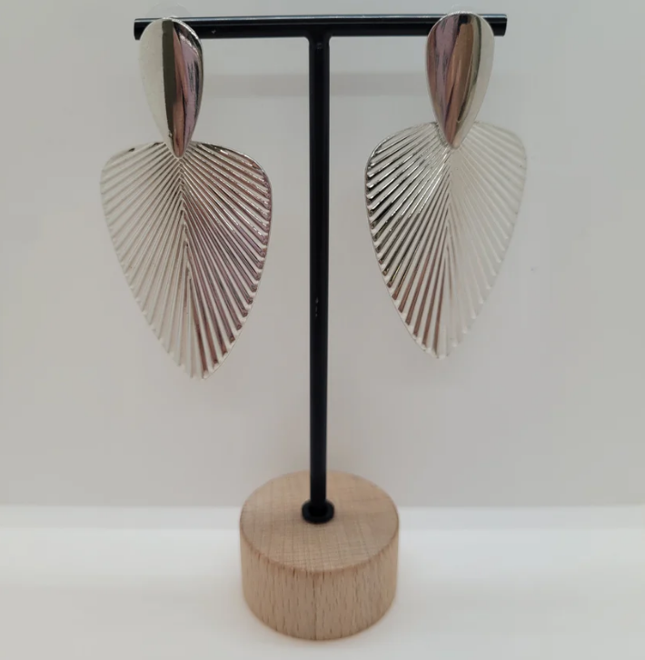 Pendientes de metal plateado con un diseño moderno. Tienen una parte superior curva y una inferior en forma de abanico con surcos finos, ofreciendo un estilo elegante y minimalista.