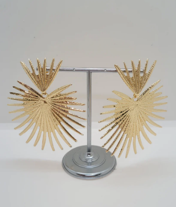 Pendientes dorados con un diseño llamativo. Tienen forma radial, con múltiples picos que se extienden desde el centro, creando un efecto de sol o estrella. Su estilo es elegante y moderno, ideal para ocasiones especiales.